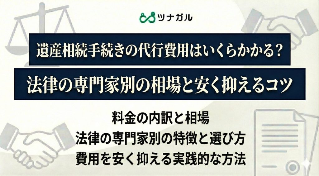 遺産相続手続きのに関する一括代行サービスの費用の目安は、遺産総額500万円以下なら25万円程度から、5000万円なら60万〜100万円が相場です。ただし、依頼する法律の専門家によって最低報酬額は異なり、司法書士は5万円〜25万円、税理士は遺産総額の0.5〜1%、弁護士は着手金と成功報酬が必要になる場合があります。費用を抑えるには、自分でできる手続きは自分で行い、複数の事務所から見積もりを取ることが重要です。